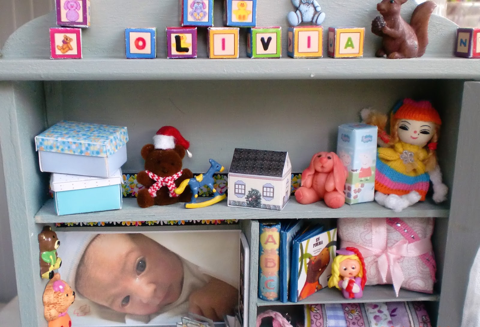...donde hay un poco de todo, básicamente de lo que tenía a mano porque me avisaron para hacerla el mismo día que nació la bebita y no sabía yo cuando se iba a entregar, así que está montada en el fin de semana. Eso sí, no faltan como en todas mis escenas de bebés una casita de papel, algún libro y la